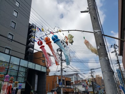 R5年度 荒町市民センター主催事業「伝統の仙台七夕飾りを作ろう」の受講生の皆さんが作ったミニ七夕をセンターのピロティ、入口に飾りました。風が吹くと揺れて梅雨のジメジメ気分を吹き飛ばしてくれます。是非ご覧ください。