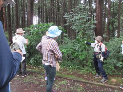 前半の講話では目黒氏制作の自然素材を使った作品の話から、本講座で落ち葉を使ったしおりを作ろうという話になりました。後半の散策ではキンミズヒキ、カクレミノ、コウゾノミ、リョウブ、ツノハシバミ等の植物を観察し説明を受け、セミの鳴き声を聞きながら、それぞれがお気に入りを探しました。
