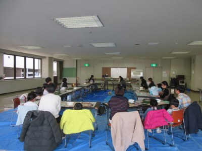 前半はカラーフェルトポーチ作り。両脇に開いている穴にリボン紐を通していきます。よれないよう通すのが少し難しいところですが、講師の方々に教えてもらいながら無事通し終え蝶結びも終了。その後、好きなパーツをつけて完成です。パーツは丸や星の形の他、犬や猫のパーツがありそれぞれ思い思いのパーツを付けていきました。猫の頭の形を、エサ置きに見立てる等、子ども達の自由なアイディアに講師から「発想が素晴らしい!」との声があがりました。