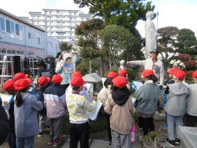 11月14日、福室市民センターを活動拠点にしている「高砂おたから探訪の会」の皆さんが講師となり、福室小の3年生を対象に、地域の歴史スポットを巡る「福室歴史ウォーク」を開催しました。お天気にも恵まれ、クラスごとに「深山神社」、「誓渡寺」、「市民センター(福室の歴史概略)」を探訪し、地域の学習をしました。クイズなども取り入れた講師のお話しに、目を輝かせ、熱心に聞き入っていたようです。講師も、これを機会に、福室の良さに気づき、地域の歴史などに興味を持ってもらえたら嬉しい、とお話ししていました。