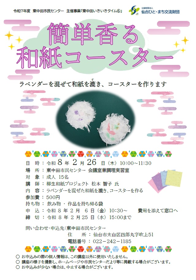 東中田いきいきタイム「簡単香る 和紙コースター」