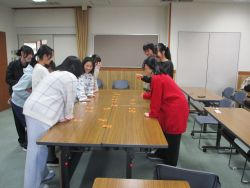 第9回定例会は、4名のジュニアリーダーが参加しました。要請の確認後、次回の定例会の内容を話し合い、バルーン研修をすることになりました。最後は、ホールでスリッパ卓球をしてみんなで盛り上がりました。初めは、卓球の経験がないメンバーもいたのでダブルスで練習をしてから、シングルスで総当たりで対戦をしました。真剣勝負でしたが、ミスの度に笑い合いながら楽しくスリッパ卓球をしました。締めに「はんこ屋さん」という、前の人が発言した単語を間違わずに繰り返しながらさらに単語を足していくゲームをして、今年最後の定例会を楽しく終えました。