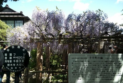 仙台市指定天然記念物「子平町の藤」が、5月1日から5日まで一般公開されました。例年より開花が早く、公開も昨年より10日程早まりました。花房は短めですが、棚いっぱいに咲いた藤は邸内に甘い香りを漂わせ、次々と訪れる方々を魅了していました。