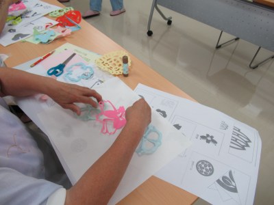 次に、様々な紋から好みのものを選び、色紙を合わせ、はさみやカッターで紋型を切り抜いていきました。