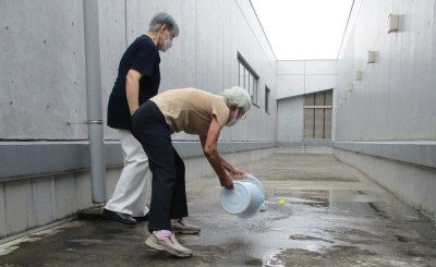 後半は実際に市民センターのベランダやトイレを使い、水道が止まった時のために水を流す体験をしました。