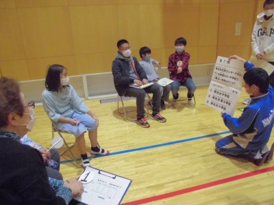 「南光台オリンピック」~ニュースポーツを楽しもう~を12月18日(土曜日)に実施しました。この事業は、子ども参画事業「元気なまちづくり応援団」の企画事業で、今年は地域の小学6年生2名、中学2年生7名の企画員で計画しました。「元気なまちづくり」のために、どんなことができるかを話し合い、6月から12月までに7回の会議、準備を経て実施したものです。当日は、子ども20名、高齢者を含む大人10名の参加で、子どもと大人が一つのグループを組み、誰にでも楽しめるニュースポーツ「ボッチャ」「バッゴー」「ストラックアウト」の種目と「南光台もの知りクイズ」のコーナーを回って、得点を競いました。参加者の多くの方から笑顔が見られ、和やかな時間を過ごし、貴重な異世代交流の場となり、皆元気になったことと思います。