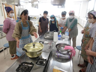 前日から水に浸けておいた大豆をミキサーで液状にし、火にかけて漉し、豆乳を作るところから豆腐づくりが始まりました。材料はシンプルながらも、温度管理やにがりを打つタイミングなど繊細な気配りが必要なため、受講生の皆さんはひとつひとつの行程を丁寧に進めていきました。その甲斐あって、全てのグループで無事に真っ白な豆腐が出来あがりました。