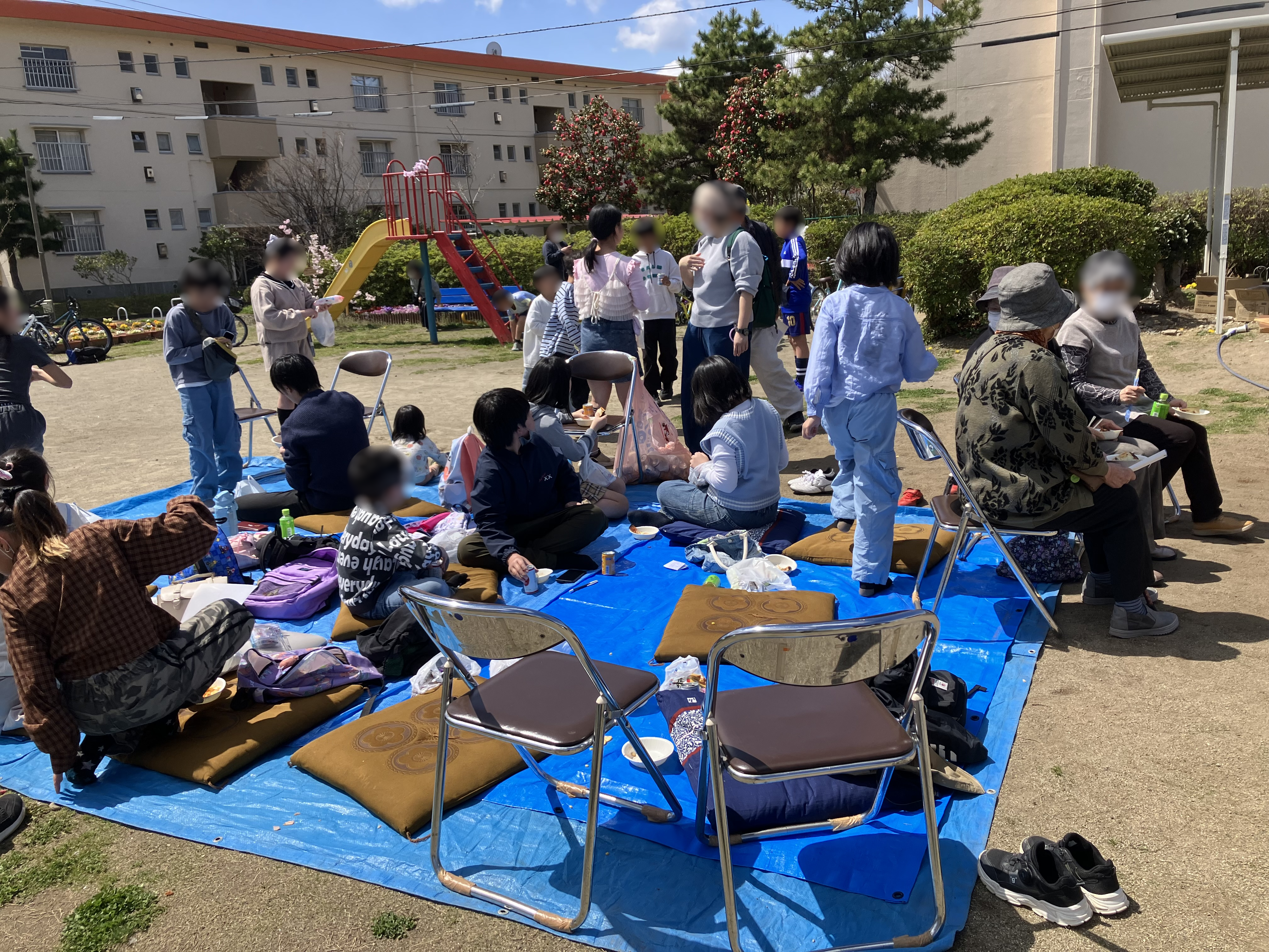 お花に囲まれた沖野団地の公園で「さくら交流会」が開催されました。沖野団地にお住まいの方はもちろん、周辺の地域の方々も大勢お越しになり、公園にはこどもたちの元気な声が響き渡っていました。