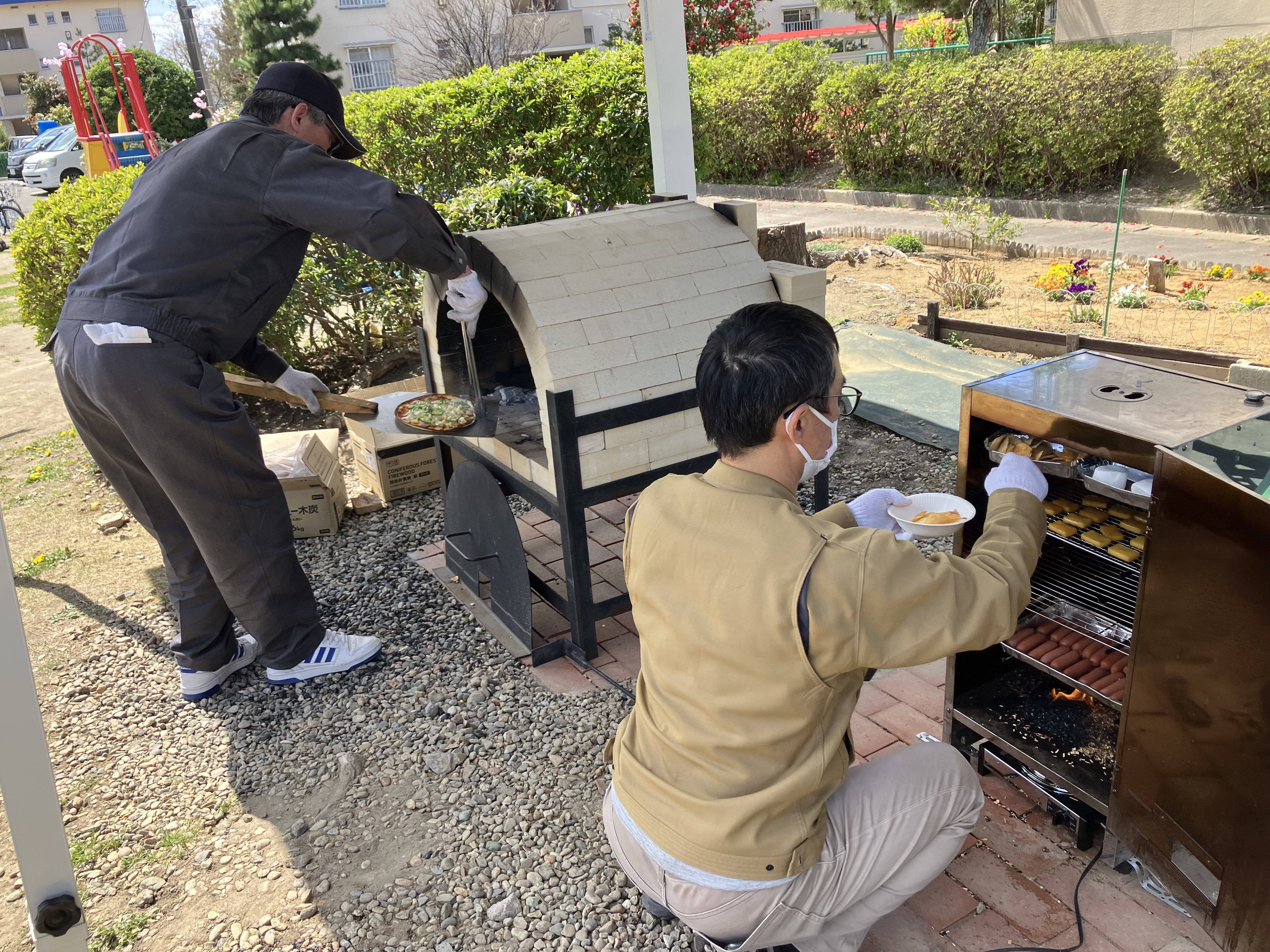 団地のピザ窯で焼いたチーズたっぷりのピザ、チーズやソーセージの燻製など、豪華なお振るまいに参加された皆さんが大喜びされていました。