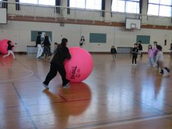 キンボールとは、直径122cmの軽くて大きなボールを床に落とさないようにチームで協力してプレーするカナダ発祥のニュースポーツ。まずはじめにボールに慣れるため、全員でボールを使った鬼ごっこを行いました。