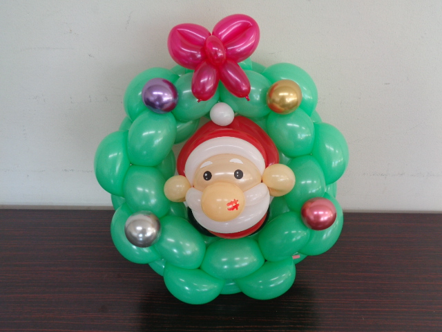 クリスマスに合わせてサンタのリースと小人のバルーンアート作品をいただきました。(作:岡本 剛)
