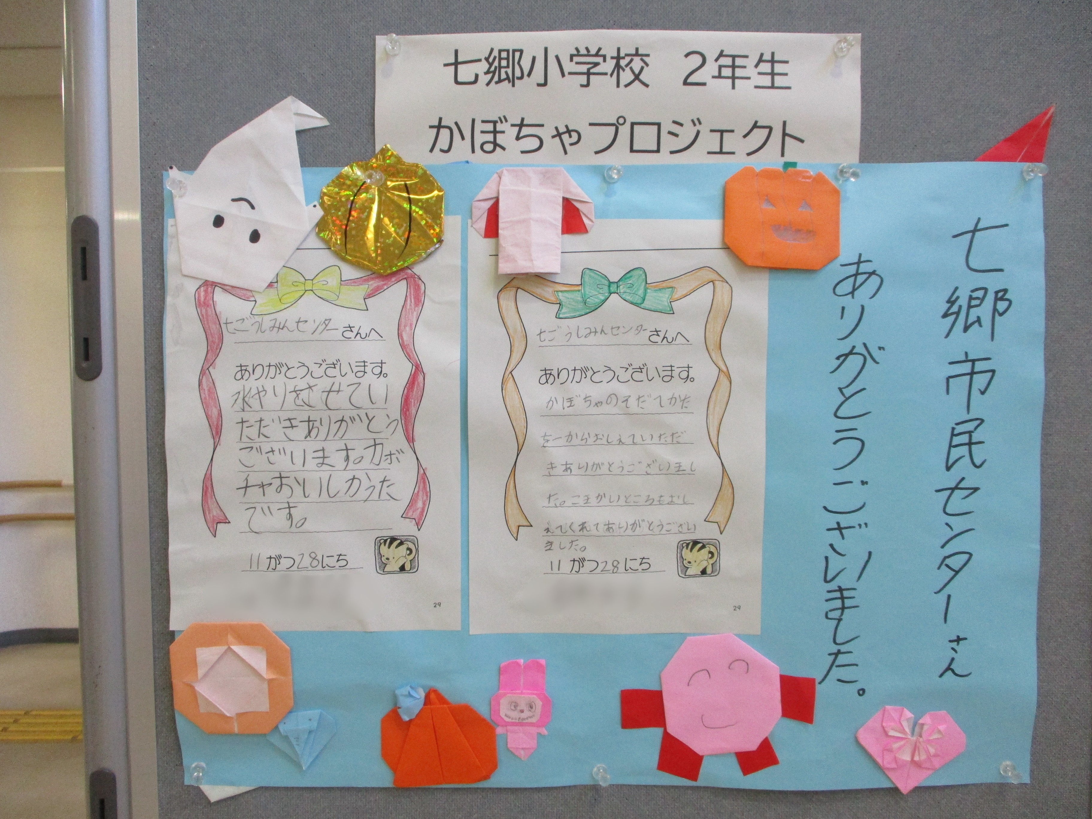 令和7年8月26日(火曜日)に仙台市立七郷小学校の2年生が、ゾウ糞エコリサイクル授業の一環として行っている「かぼちゃプロジェクト」のかぼちゃ収穫を行いました。収穫のお手伝いをした際のお礼としていただいたお手紙を、市民センターのロビーにて展示しています。