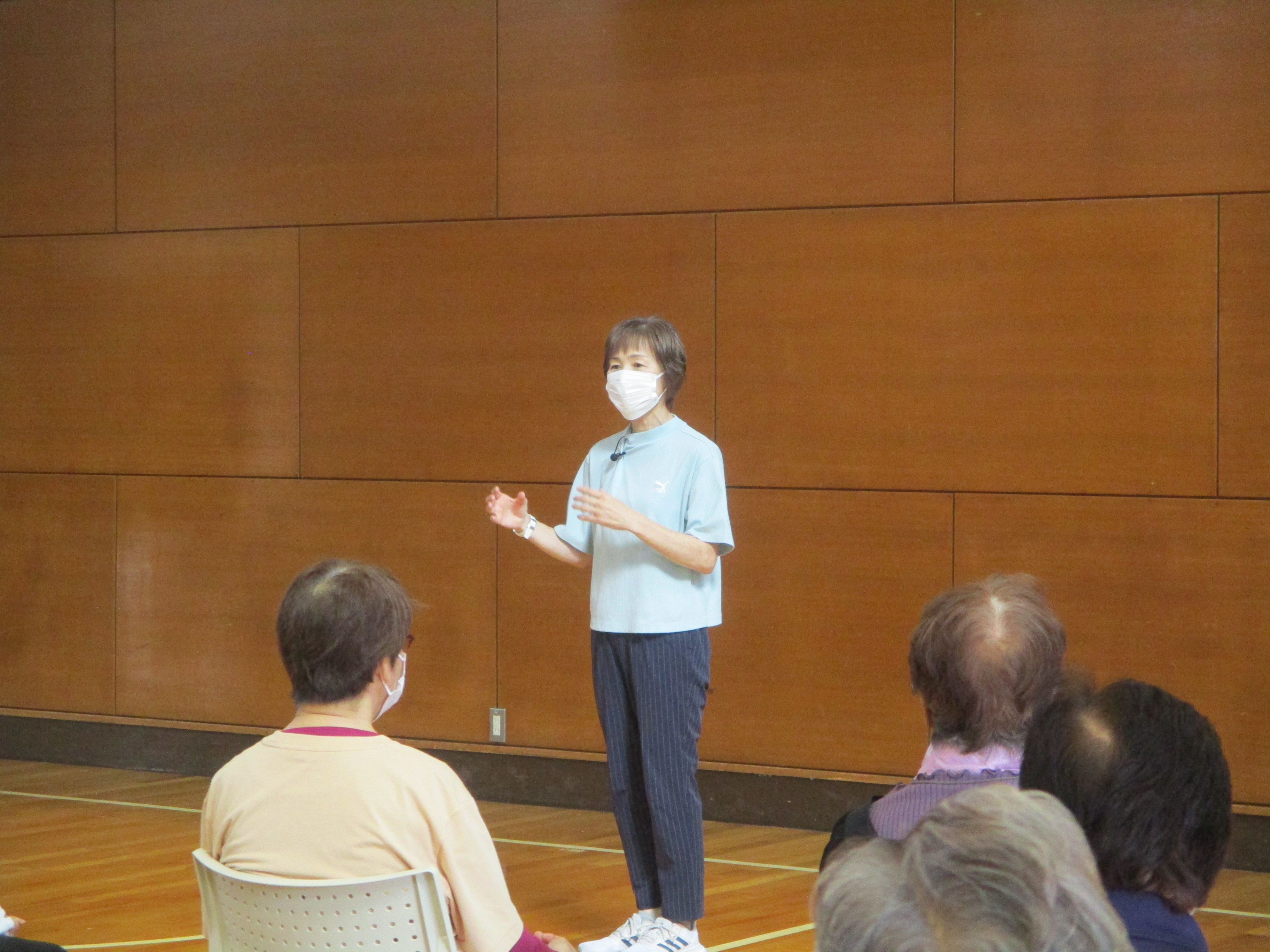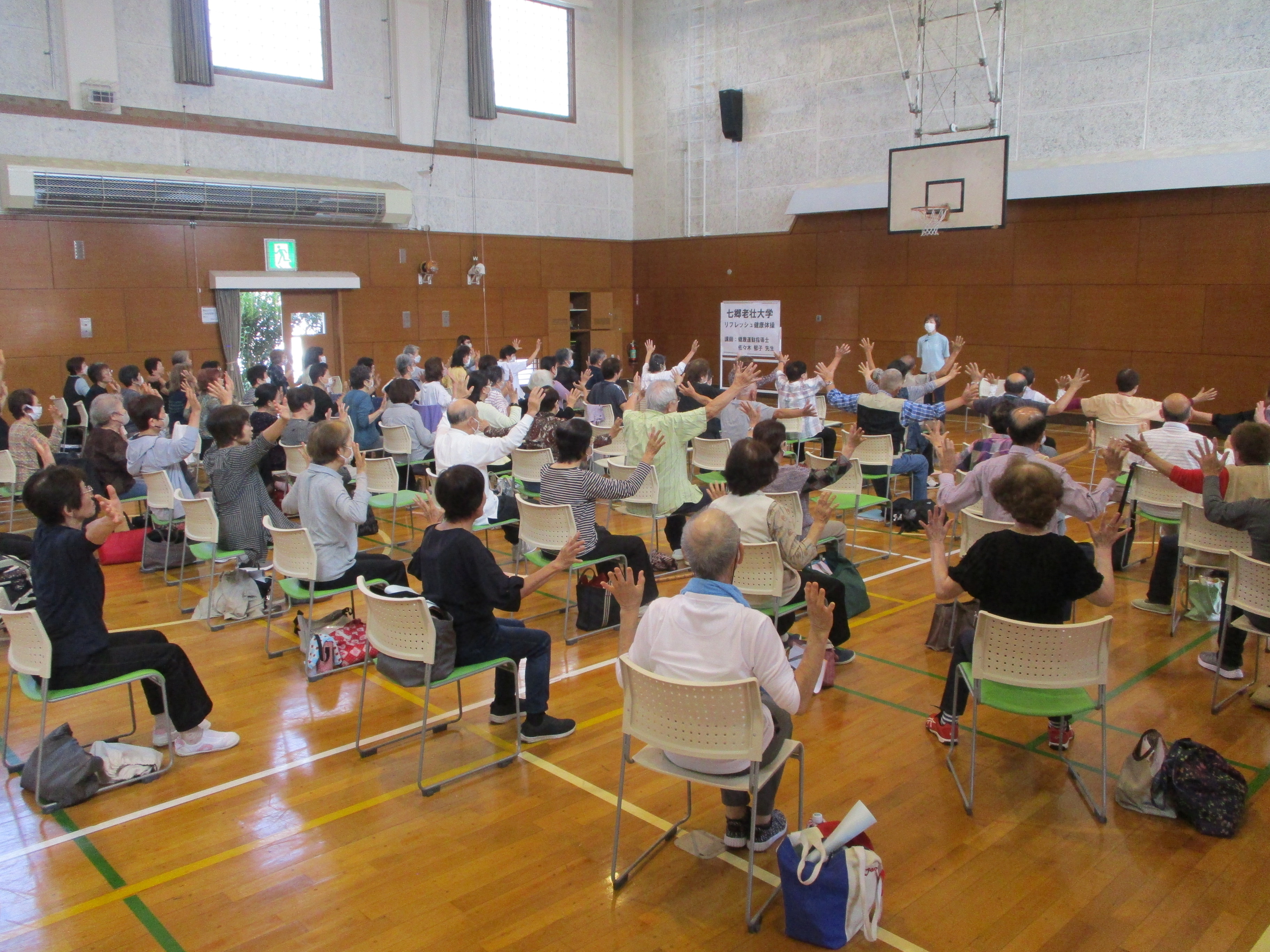 毎年恒例の「リフレッシュ健康体操」。佐々木氏から「今年も皆さんの元気な姿を見ることができて嬉しいです。」とのご挨拶をいただきスタートしました。