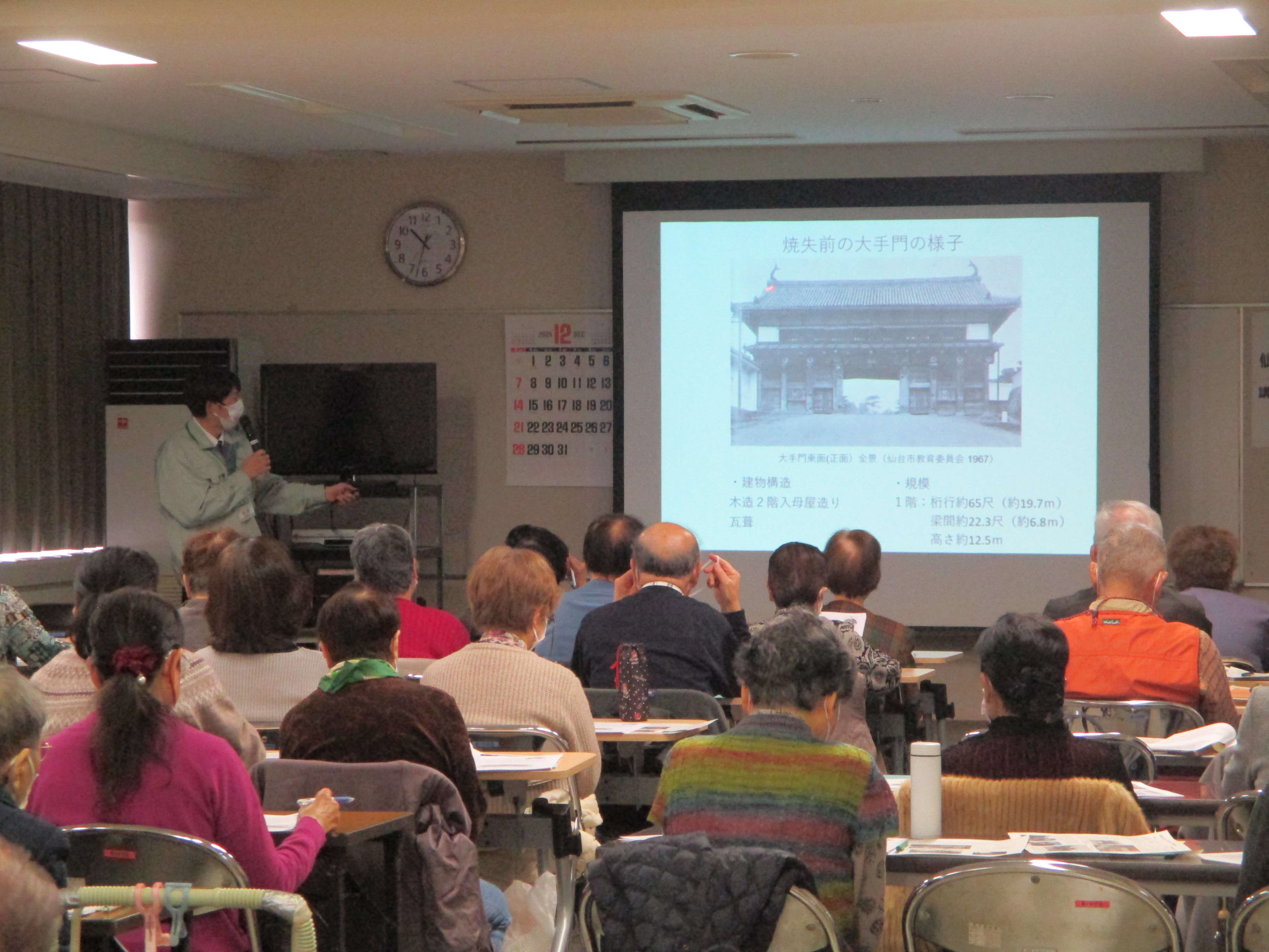 昭和20年の仙台空襲で焼失してしまった大手門がどのような門だったのか、当時の写真をもとに、明治から昭和にかけての移り変わりを説明していただいた後、現在行われている、復元作業に向けた発掘調査の状況についてお話しいただきました。講座の最後に今後の復元作業の展望をお聞きし、受講生の皆さんは将来復元される大手門に期待が高まった様子でした。