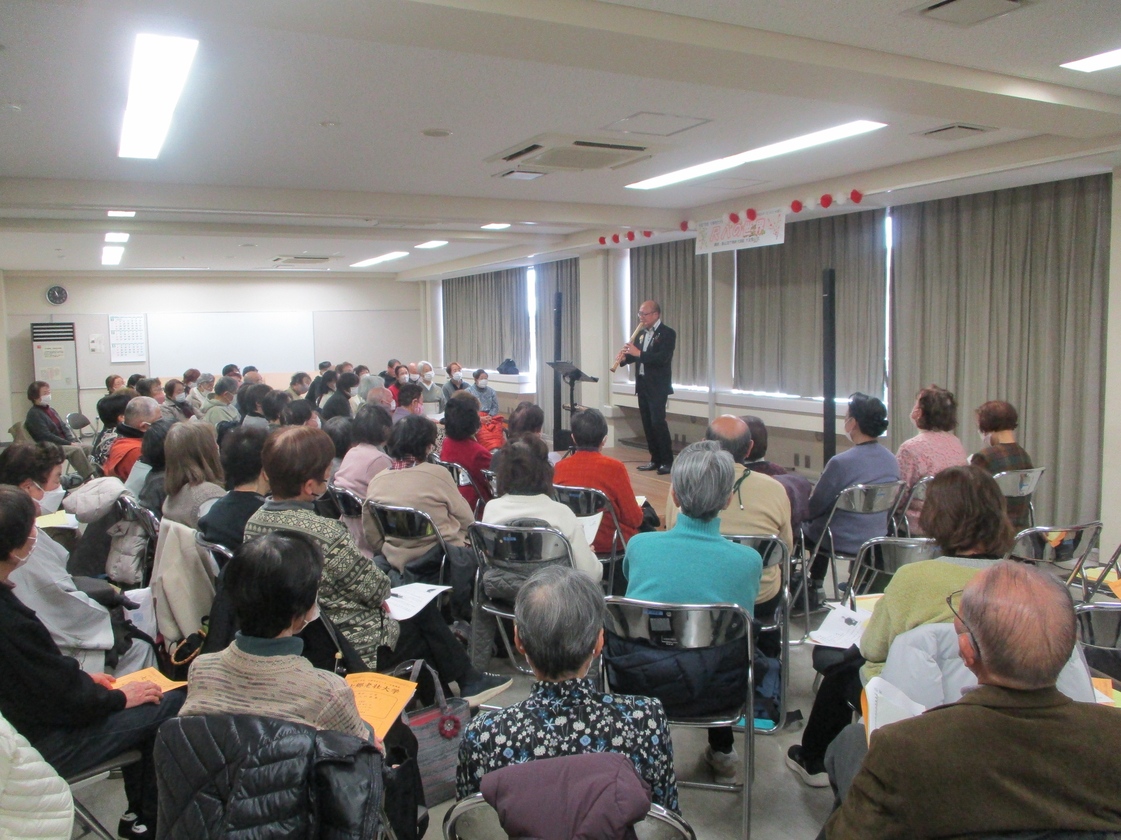 都山流竹琳軒 大師範の大友 憧山 氏を講師にお迎えし、第8回「尺八の世界」を開催しました。当日は75名が参加し、尺八の演奏を堪能しました。