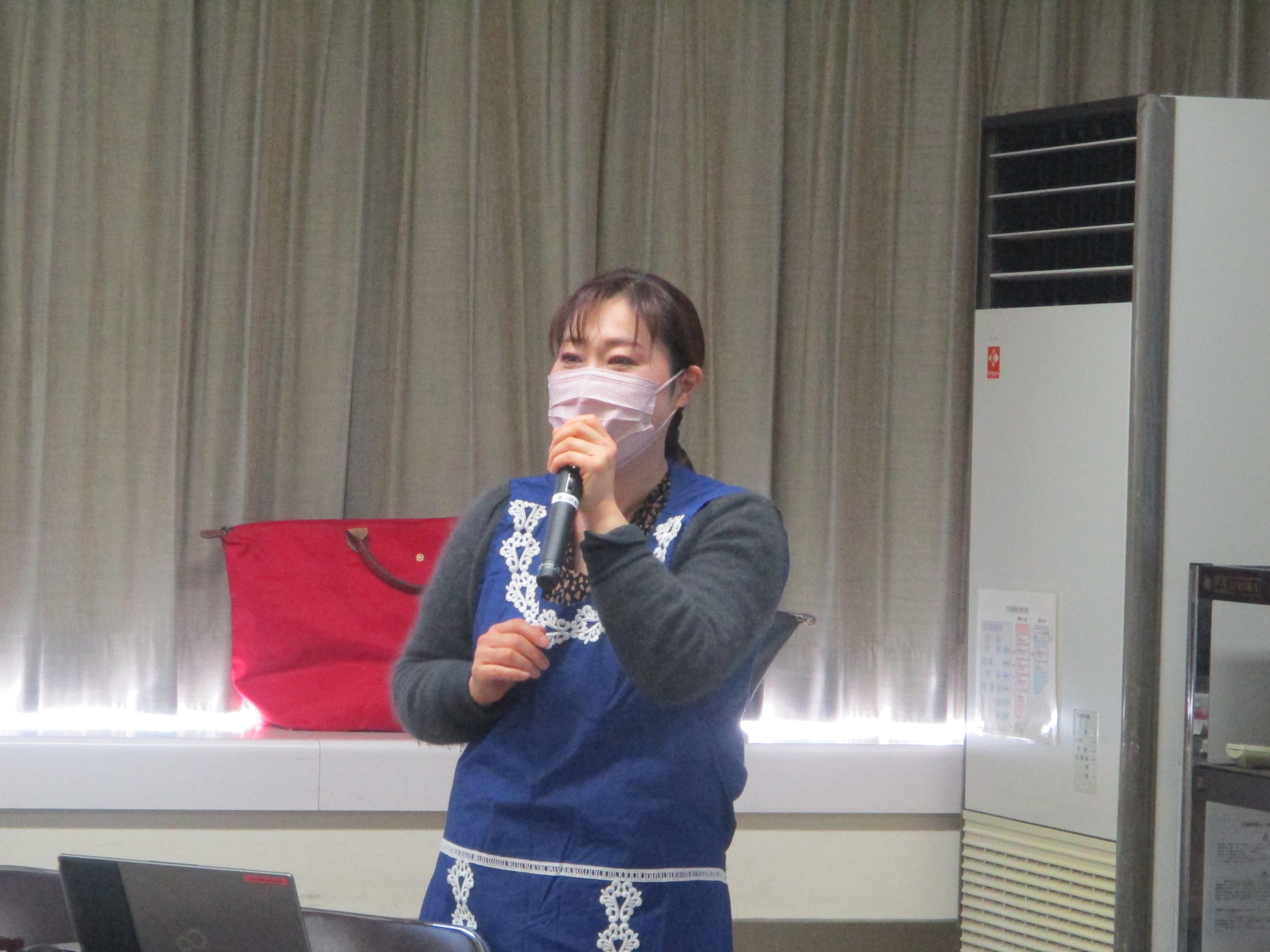 前半はスマイリー・チバ 氏による、口腔フレイル予防についての講話でした。脳トレを兼ねた誤嚥予防の発声練習では、リズムに合わせて手を動かしながら声を出すという一連の動作が想像以上に難しく、「リズムが速くて手が追い付かない」「声と手がずれてしまう」といった声が所々にあがっていました。