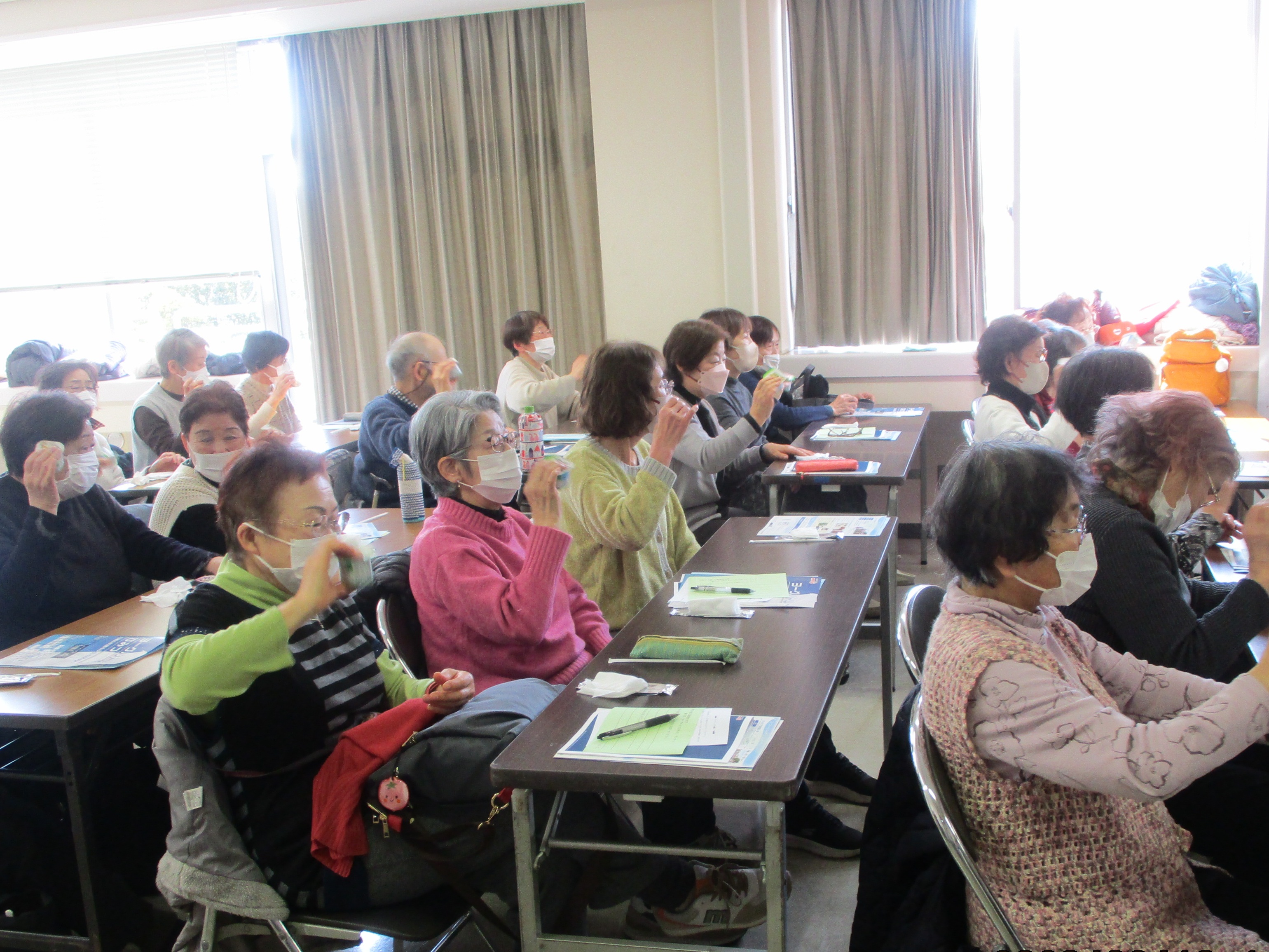 イスに座ったまま行う手足の運動や、その場に立ってできる運動のほか、手や指の動きと発声を組み合わせた脳トレ等を行いました。日頃意識して運動することが少なくなってきたという受講生も多く、今回の講座を通してリフレッシュできたようでした。