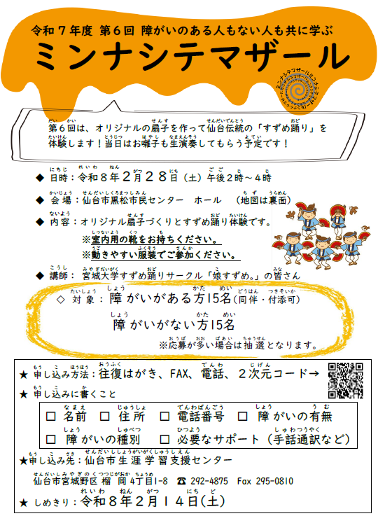 トップページ > 市民センターを探す > 仙台市生涯学習支援センター > 講座のご案内 > 障害のある人もない人も共に学ぶ「ミンナシテマザール」(第6回)のご案内