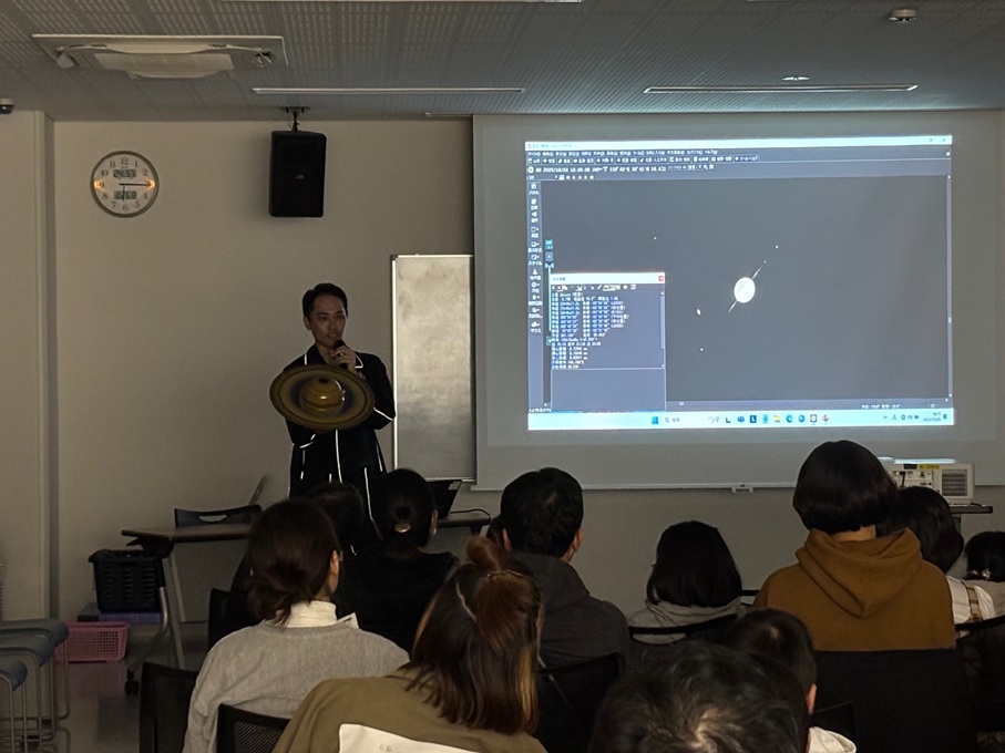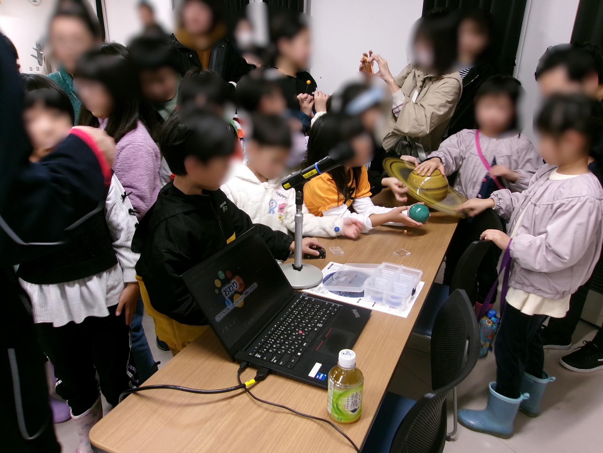 今年は土星の輪が、円盤のように立体的に見えず、串刺しのお団子のように一直線に見える珍しい年だとか。なぜそのように見えるのか、それは土星がちょうど真横に見えるからということで、土星の模型を持った職員さんがぐるりとみんなの周りをまわって見え方の違いを観察しました。