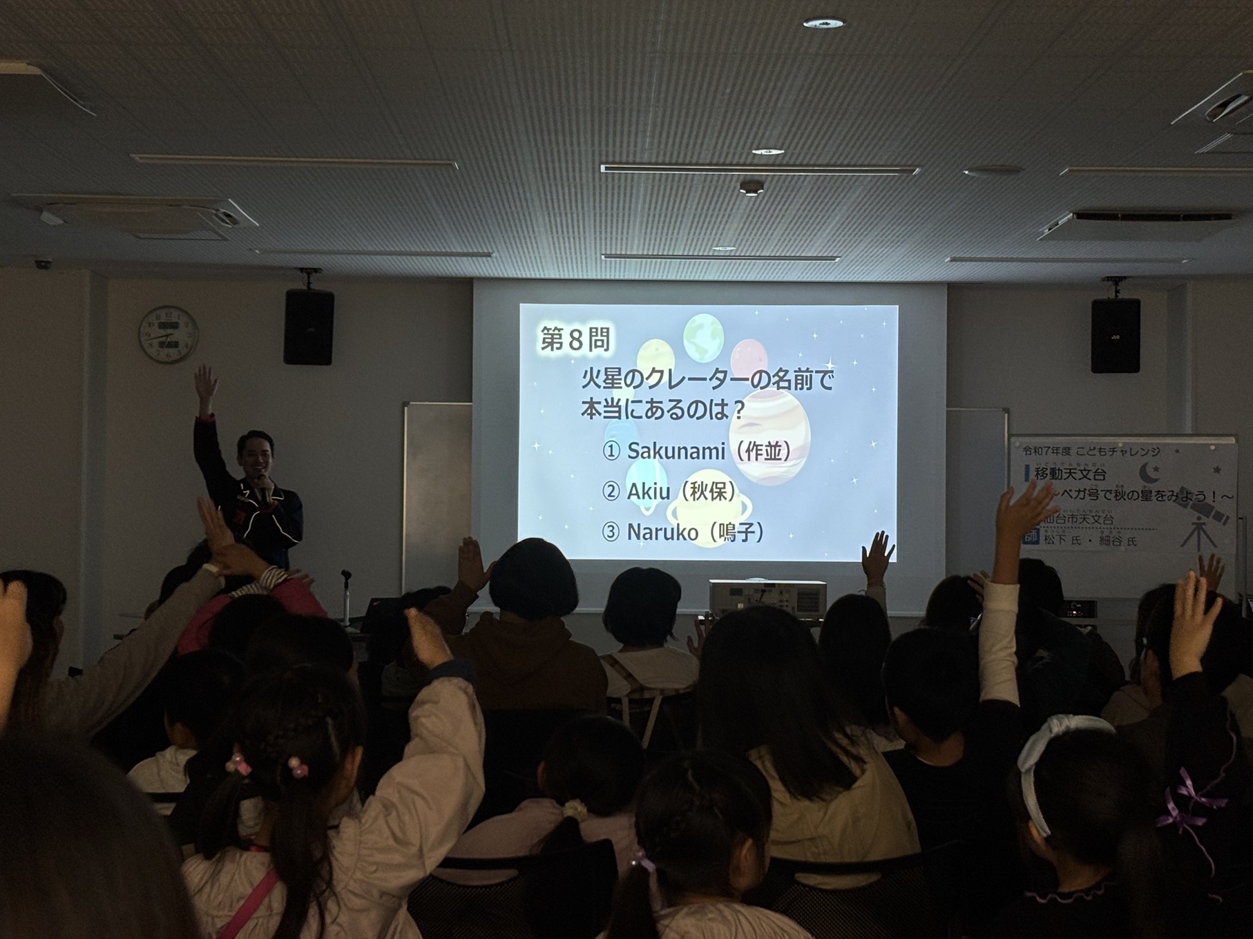 次に仙台市天文台の職員さんでも難しいという10問のクイズに挑戦しました。「水金地火木土天海冥」で知られる太陽系の惑星について、実は2006年に冥王星は太陽系の惑星から外れ、準惑星となったことが説明されると、こどもたちよりも保護者のみなさんから驚きの声があがる一幕もありました。