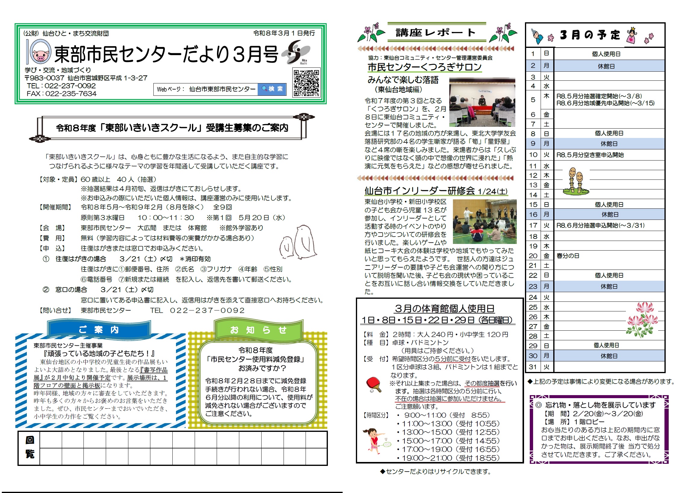 東部市民センターだより令和8年3月号のお知らせ