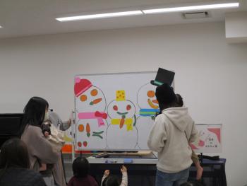 一般社団法人 音楽のおもちゃ箱 より、榎本 未来さん、今野 佳奈さん、髙橋 恭子 さんをお招きし、音楽鑑賞やリズム遊び、楽器を使った遊びや手遊び、人形劇などを楽しみました。音楽に合わせて楽器を鳴らしたり、スカーフを丸めたり広げたり振ったりなど体をたくさん動かしたり、ホワイトボードに描かれた、雪だるまの家族の顔を、マグネット付きの野菜・果物の絵を貼り付けて完成させたりと、様々な遊びで楽しみました。
