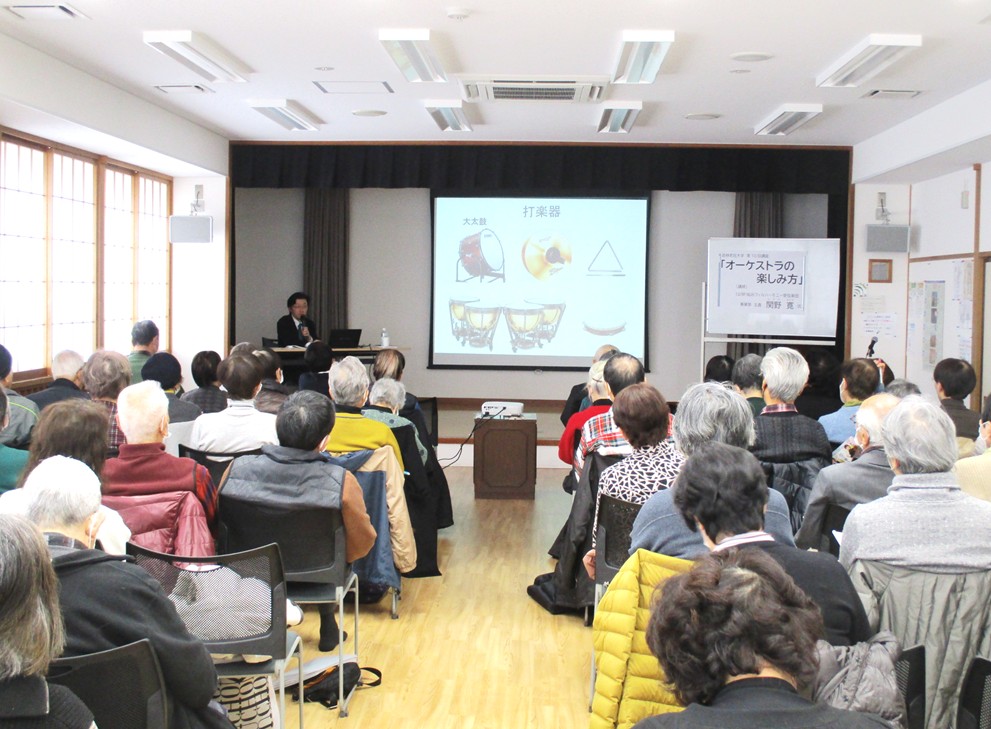 (公財)仙台フィルハーモニー管弦楽団 事業部主査の関野寛氏をお招きし、講座を開催しました。前半は、オーケストラの基礎知識として、弦楽器・木管楽器・金管楽器・打楽器の4種類の構成に関するご説明をいただきました。プロの演奏家からの話やクラシックの代表曲の試聴を通して、各楽器が様々な特徴を担いながら活躍していること、また演奏の裏側などを教えていただきました。後半は、演奏を聴く上でのポイントについてご講話いただきました。会場全体が気持ち良く演奏を楽しめるように配慮をしながら気軽にオーケストラを聴いてほしいとの話がありました。受講生の皆様は、オーケストラに関するクイズを進めながら興味深い様子で講話を聞いていました。