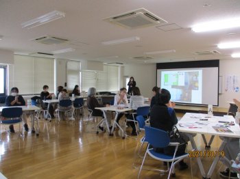 講座は、講師の歌川先生から子どもの作品を飾る4つのポイント1.舞台:飾る場所 2.テーマ:季節やイベント 3.配役:何を飾る 4.演出:どう飾るか等、具体的な事例を教わりました。プロジェクターに映し出された画面を見ながら、参加者が自由に意見を言い合い語り合える時間は、世代を超えて楽しい交流の時間になっていました。アンケートからも「自分には無かった視点を得る事ができた。」「具体的な事例をたくさん学べ、これから活かせるヒントをもらった。」「イメージが付きやすくやってみようと思えるような楽しい時間だった。」「コロナの中で一つでも進めた。気持ちが楽になった。」という声があり、楽しく学びあえる姿がうかがえました。